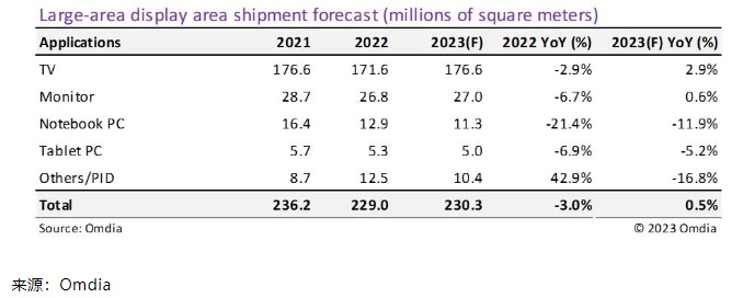 2023年的显示面板的面积与出货量呈反比,Omdia预计由于电视显示面板尺寸的增加,2023年大尺寸显示面板的出货面积将年度同比增加0.5%。由于消费者对游戏显示面板需求相对良好,显示面板的出货量也预计将同比增加0.6%。