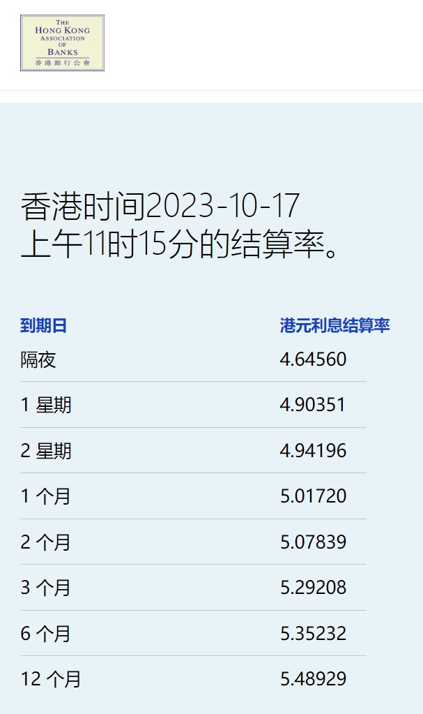 智通财经APP获悉,10月17日,港元拆息全线上扬,其中,与楼按相关的一个月拆息两连升,重上5%水平,报5.01720%,反映银行资金成本的三个月拆息连升三天,报5.29208%,创三周新高,与同期美元LIBOR息差收窄37基点。隔夜息回升至4.64560%,一周钱报4.90351%。长息方面,六个期及一年期分别反弹至5.35232%及5.48929%。