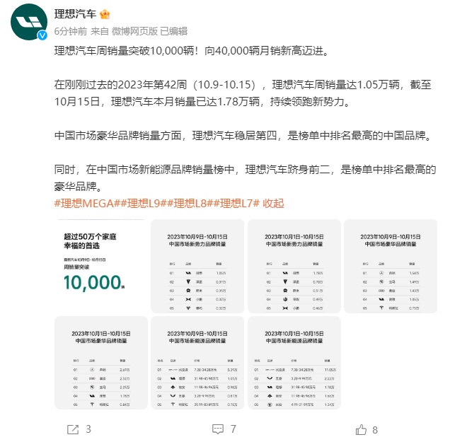 智通财经APP获悉,10月17日,理想汽车(02015)官微宣布,理想汽车周销量突破10000辆,向40000辆月销新高迈进。在刚刚过去的2023年第42周(10.9-10.15),理想汽车周销量达1.05万辆,截至10月15日,理想汽车本月销量已达1.78万辆,持续领跑新势力。中国市场豪华品牌销量方面,理想汽车稳居第四,是榜单中排名最高的中国品牌。同时,在中国市场新能源品牌销量榜中,理想汽车跻身前二,是榜单中排名最高的豪华品牌。