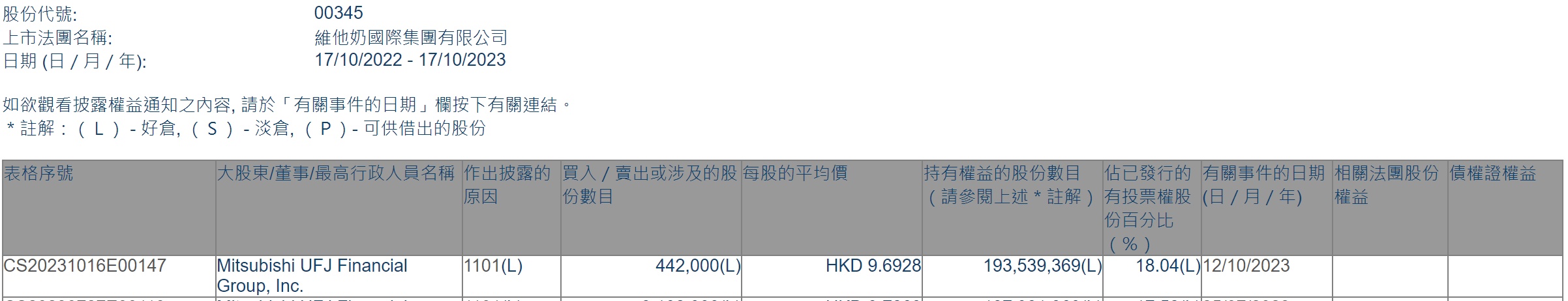 智通财经APP获悉,香港联交所最新资料显示,10月12日,三菱日联金融增持维他奶(00345)44.2万股,每股作价9.6928港元,总金额约428.42万港元。增持后最新持股数目约为1.94亿股,最新持股比例为18.04%。