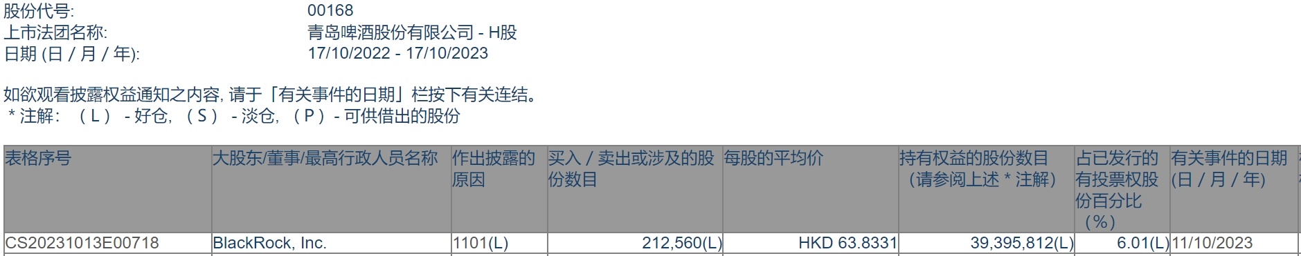 智通财经APP获悉,香港联交所最新资料显示,10月11日,贝莱德增持青岛啤酒股份(00168)21.256万股,每股作价63.8331港元,总金额约为1356.84万港元。增持后最新持股数目约为3939.58万股,最新持股比例为6.01%。