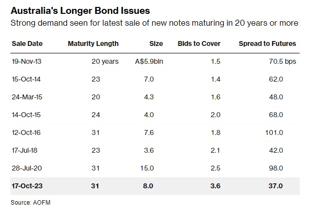 另外,在发行前后,澳大利亚新国债的收益率比10年期国债期货的投标收益率高出37个基点。AOFM为此次发行设定了37至43个基点的区间。