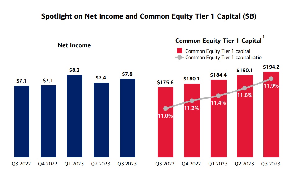 此外,美国银行的投资银行业务和交易业务部门在全行业低迷的情况下实现了更高的营收规模,超出分析师普遍预期。第三季度美国银行投资银行费用总额增长 2%,达到 12 亿美元,而销售和交易营收增长 8%,达到 44 亿美元。