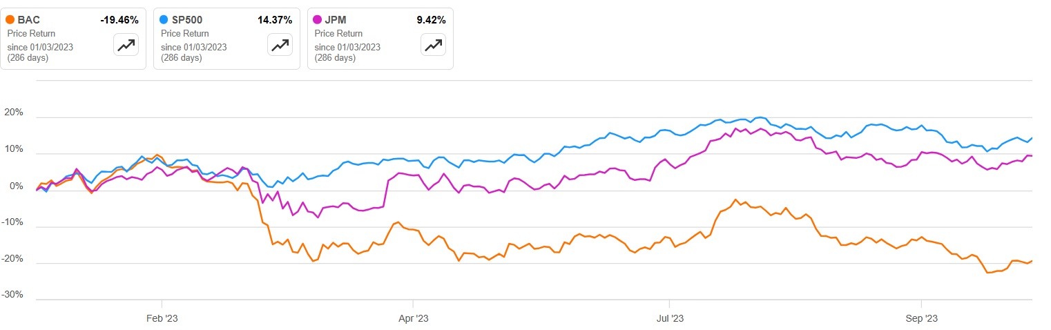 美国银行(Bank of America)本应是今年美国利率上升的最大受益者之一。然而,美国银行股价在2023年的华尔街大型银行同行中表现最差,主要因为美国银行在新冠疫情期间大量买入低收益率的长期证券,随着利率不断攀升,这些证券资产价格暴跌,因此美国银行为实现亏损大幅增加,上半年分析师们一度认为美国银行势必陷入流动性危机。