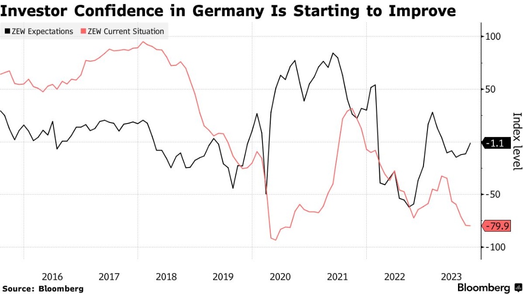 智通财经APP获悉,德国投资者信心连续第三个月改善,这表明人们希望结束一年多的加息可以帮助这个欧洲最大的经济体克服目前的疲软。据了解,ZEW研究所的预期指数从9月份的-11.4缩窄至10月份的-1.1,好于经济学家的预测。