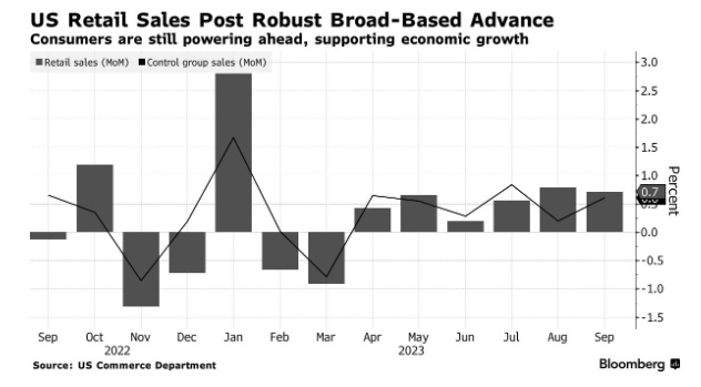 这些数据增强了人们对第三季度经济增长强劲的预期。同时,9月物价数据显示通胀顽固的情况下,消费需求的持续强劲也有可能促使美联储在年底前再次加息。