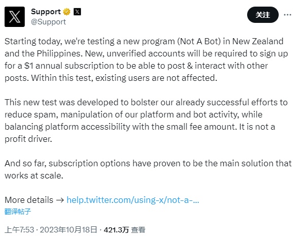 智通财经APP获悉,马斯克旗下社交媒体平台X周三宣布,将在新西兰和菲律宾测试一个新项目。新的、未经验证的帐户将需要缴纳1美元的年订阅费才能发帖和与其他帖子互动。在此次测试中,现有用户不受影响。X表示,这不是利润驱动的,而是为了减少垃圾邮件、自动机器人账户和对其服务的操纵。