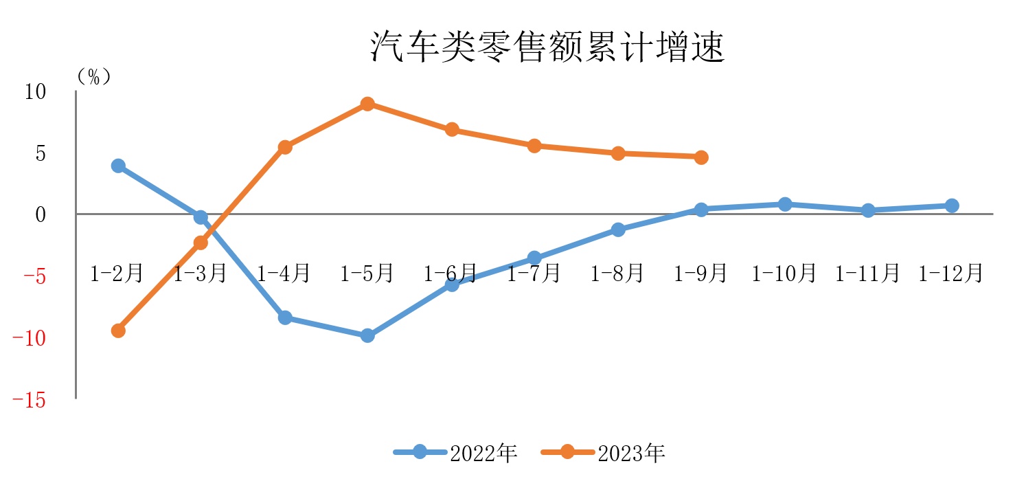 9月,汽车类零售额为4383亿元,同比增长2.8%,占全社会消费品零售总额的11.0%。1-9月,汽车类零售额为34837亿元,同比增长4.6%,占全社会消费品零售总额的10.2%。
