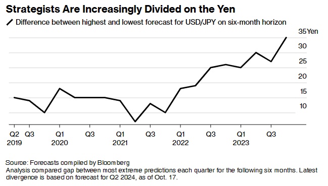 智通财经APP获悉,华尔街对日元的走势出现了巨大分歧。高盛、瑞穗美洲、摩根大通和美国银行认为,日元将跌至30多年来的最低水平。其他人则认为,美元兑日元汇率到明年一季度末将降至140,到2024年底将进一步降至130。事实上,根据媒体对未来6个月每个季度的汇率预测进行比较的分析,华尔街分析师们现在的看法是自2016年以来分歧最大的。