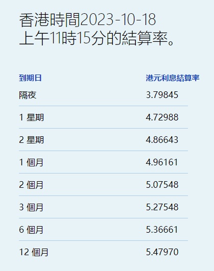 智通财经APP获悉,10月18日,港元拆息几乎全线走低,仅六个月期维持升势。隔夜息大幅回落近85基点至3.79845%,为9月11日以来最低。与楼按相关的一个月拆息亦中止两连升,重返5%以下,报4.96161%。