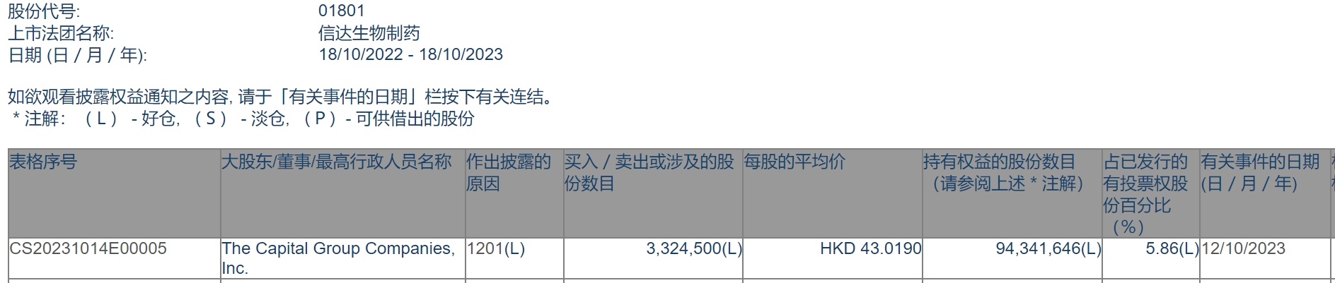 智通财经APP获悉,香港联交所最新资料显示,10月12日,美国资本集团减持信达生物(01801)332.45万股,每股作价43.0190港元,总金额约为1.43亿港元。减持后最新持股数目约为9434.16万股,最新持股比例为5.86%。