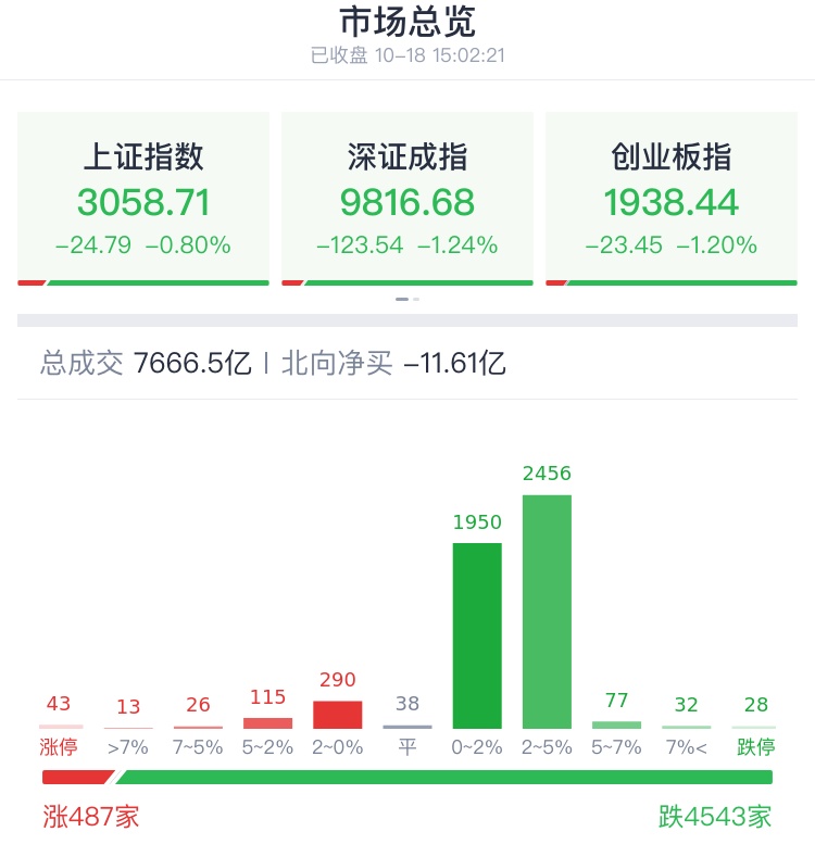 受此影响,10月18日,A股低开低走,深成指、创业板指均再创年内新低。截至收盘,沪指跌0.80%,报3058.71点;深成指跌1.24%,报9816.68点;创业板指跌1.20%,报1938.44点。