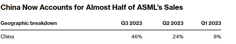 最新的统计数据显示,中国市场占阿斯麦第三季度总销售额的大约46%,而上一季度为24%,1-3月则仅仅占大约8%。