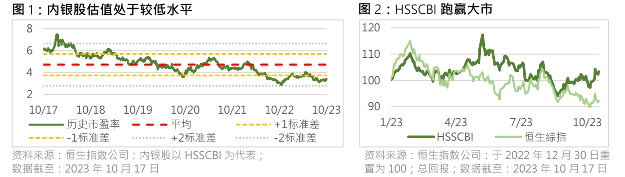四大内银在恒生港股通中国内地银行指数的合共权重约 41%。中央汇金的增持行动展现出政府的强劲支持,既提升了内银股的投资气氛,亦可能意味着内银板块在经过多年的整固之后,价值开始浮现。截至 10 月 17 日,以恒生港股通中国内地银行指数为代表的内银股的历史市盈率仅 3.4 倍,较其 5 年平均水平 4.7 倍低逾 1 个标准差(图 1),反映内银板块相对其长期平均水平被低估。