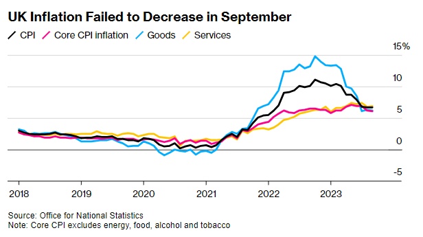 智通财经APP获悉,由于油价上涨抵消了食品成本带来的下行压力,英国9月份的通胀未能如预期放缓。英国国家统计局周三表示,9月消费者价格指数(CPI)同比上涨6.7%,涨幅与上月持平,经济学家预期为6.6%。