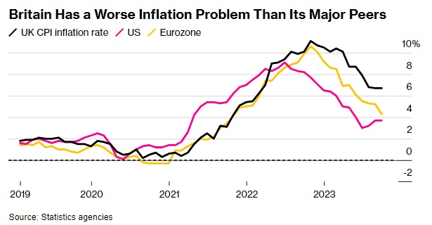 数据显示,核心通胀率(不包括波动较大的食品和能源价格)从6.2%降至6.1%,市场预期为6.0%。英国央行密切关注的服务业通胀率意外从6.8%加速至6.9%。