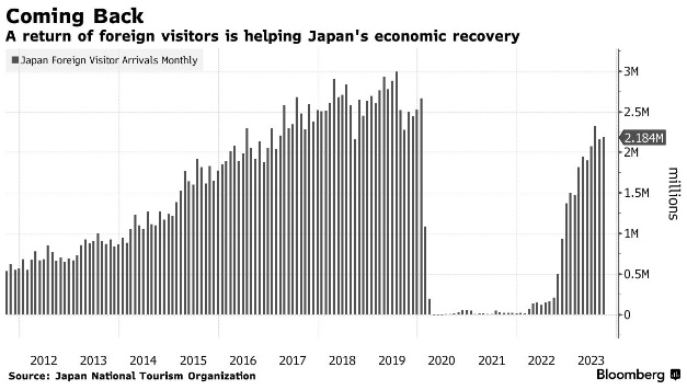整体入境游一直是日本经济复苏的亮点,因日元走软提振了海外游客的消费能力。在政府数据中,入境游被视为服务出口。今年第三季度,美元兑日元的平均汇率为144.61日元,而2019年同期的平均汇率为107.34日元。
