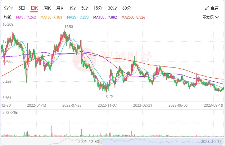 或受到上述消息刺激,10月17日特步国际股价高开高走,截至当天收盘,该股报收7.37港元,涨幅4.1%。值得一提的是,拉长时间来看,特步国际当前股价依然整体处于弱势寻底的趋势中,从去年年初至今该股累计跌幅超过了40%。