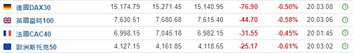 2. 截至发稿,德国DAX指数跌0.50%,英国富时100指数跌0.58%,法国CAC40指数跌0.45%,欧洲斯托克50指数跌0.61%。