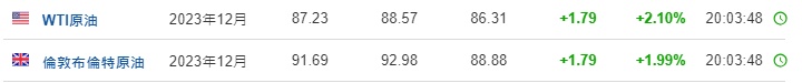 3. 截至发稿,WTI原油涨2.10%,报87.23美元/桶。布伦特原油涨1.99%,报91.69美元/桶。