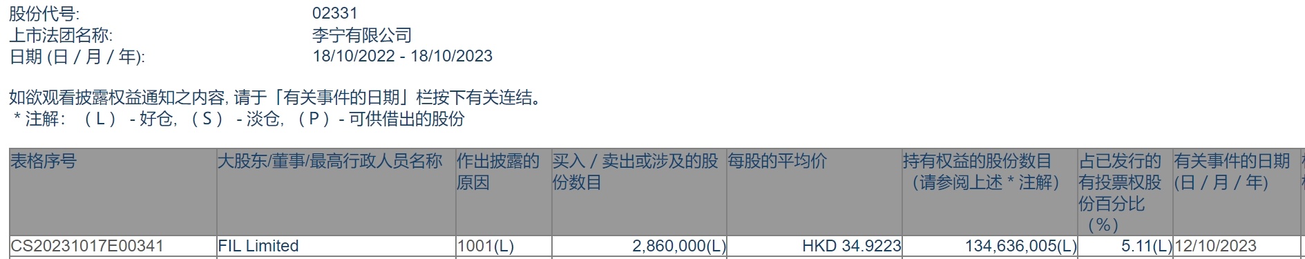 智通财经APP获悉,香港联交所最新资料显示,10月12日,FIL Limited增持李宁(02331)286万股,每股作价34.9223港元,总金额约为9987.78万港元。增持后最新持股数目约为1.35亿股,最新持股比例为5.11%。