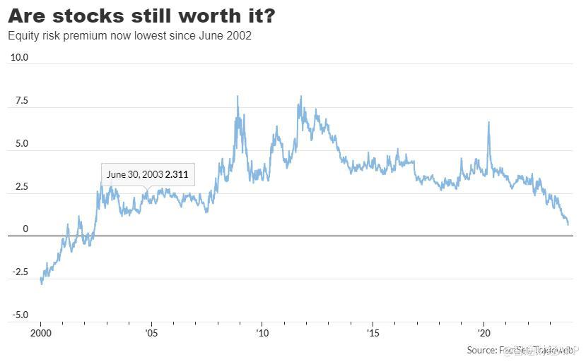 ERP在今年一直在缩小,引起了股票分析师的注意,而在此之前的十多年中,它几乎不太受关注。有人猜测,ERP可能很快会跌破零,这将是自2002年上半年以来的首次。根据道琼斯的数据,上次出现这种情况是在2002年5月23日,当时的溢价缩小到了负0.055个百分点。