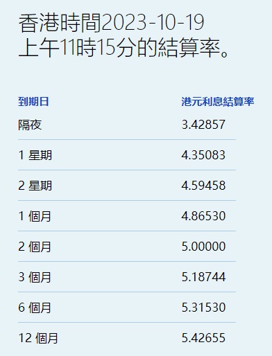 智通财经APP获悉,10月19日,港元拆息全线下跌,短息跌幅尤为明显。其中,隔夜息两连跌,再降37基点至3.42857%,为9月7日以来最低。与楼按相关的一个月拆息亦连跌两天,低见4.8653%,创逾五周新低。