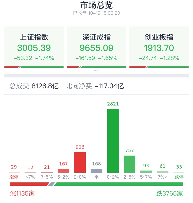 10月19日,A股低开低走,三大指数均创年内新低。贵州茅台等大蓝筹集体熄火,沪指险守3000点,上证50收跌2.65%。