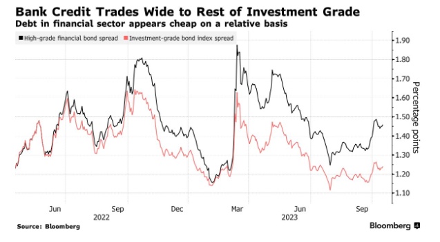 大举发债可能表明,银行预计未来借贷成本会继续上升。根据汇编数据显示,截至周二,金融机构债券的平均利差为146个基点,比更广泛的高评级债券指数的利差高出22个基点。