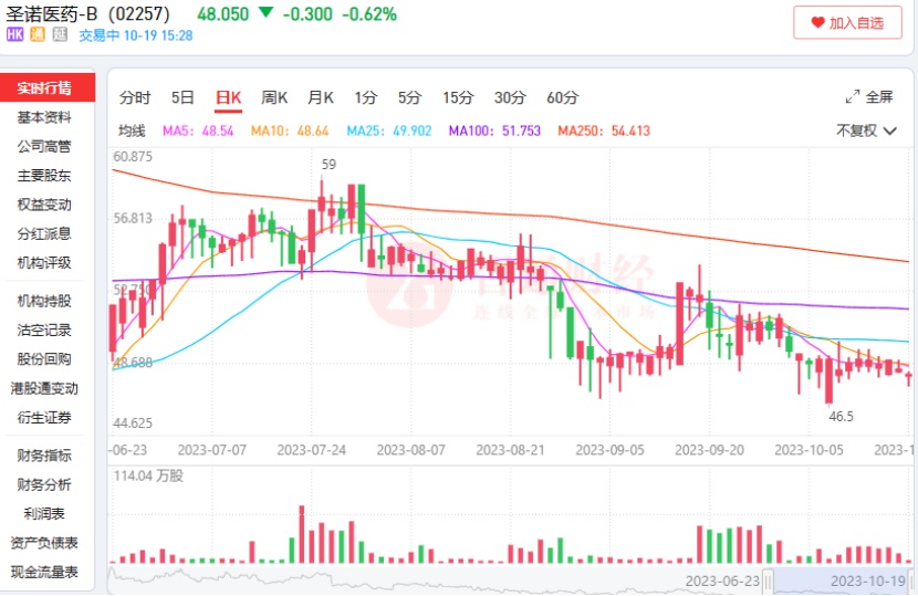 以港股小核酸药物研发第一股的圣诺医药-B(02257)为例,今年下半年,在触及股价高点59港元后,圣诺医药股价便持续波动下跌,并于今年10月9日触及区间低点46.5港元,区间跌幅达到21.19%。