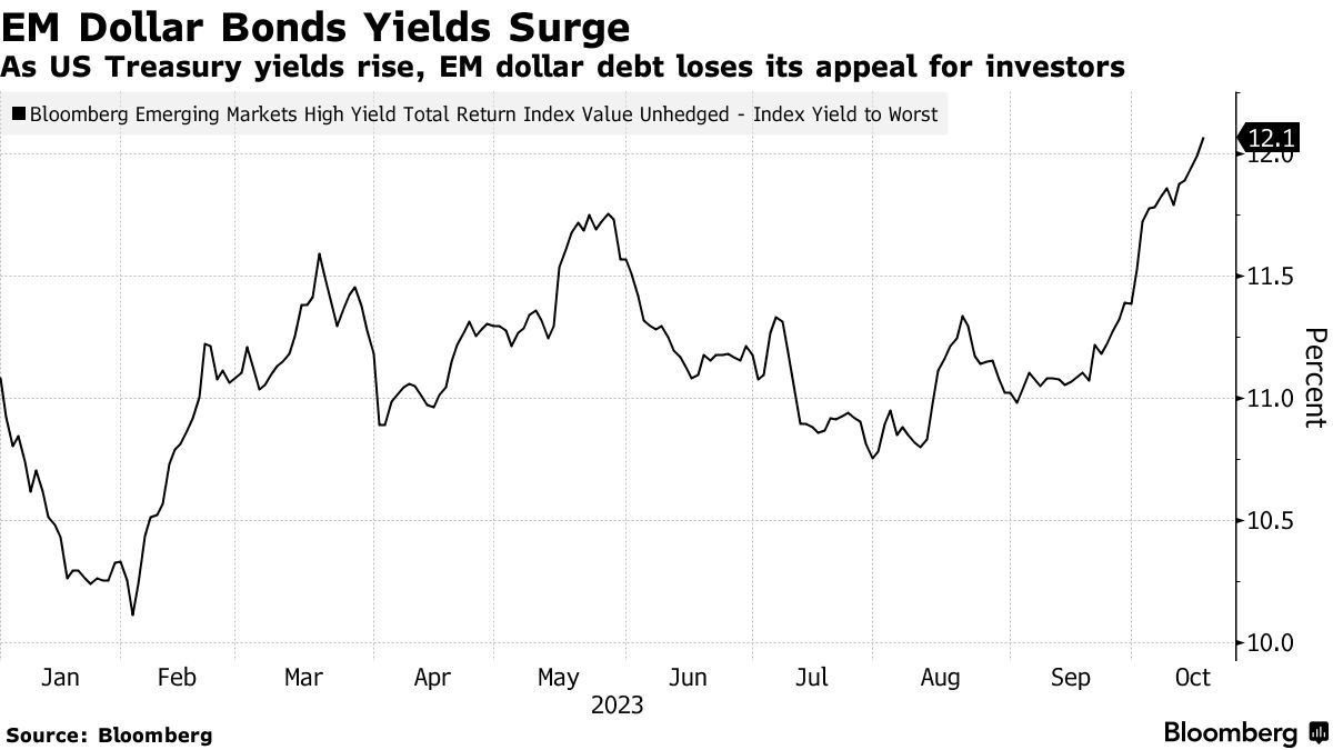 10年期美国国债收益率已经连续四天上涨,自2007年以来首次接近5%。这加大了新兴市场资产的估值压力,当美元因避险属性而走强以及长期限美债收益率上行时,新兴市场的美元债等各类资产通常会失去投资吸引力。