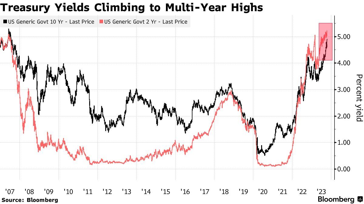 来自T. Rowe Price的基金经理Scott Solomon曾指出10年期美债收益率有可能向上测试5.5%。“在一些传统债券买家和那些认为收益率水平是一个很好的长期投资机遇的人之间出现了一些反复的拉锯战。这些传统债券买家在久期调整方面被迫陷入了买方势力罢工。"