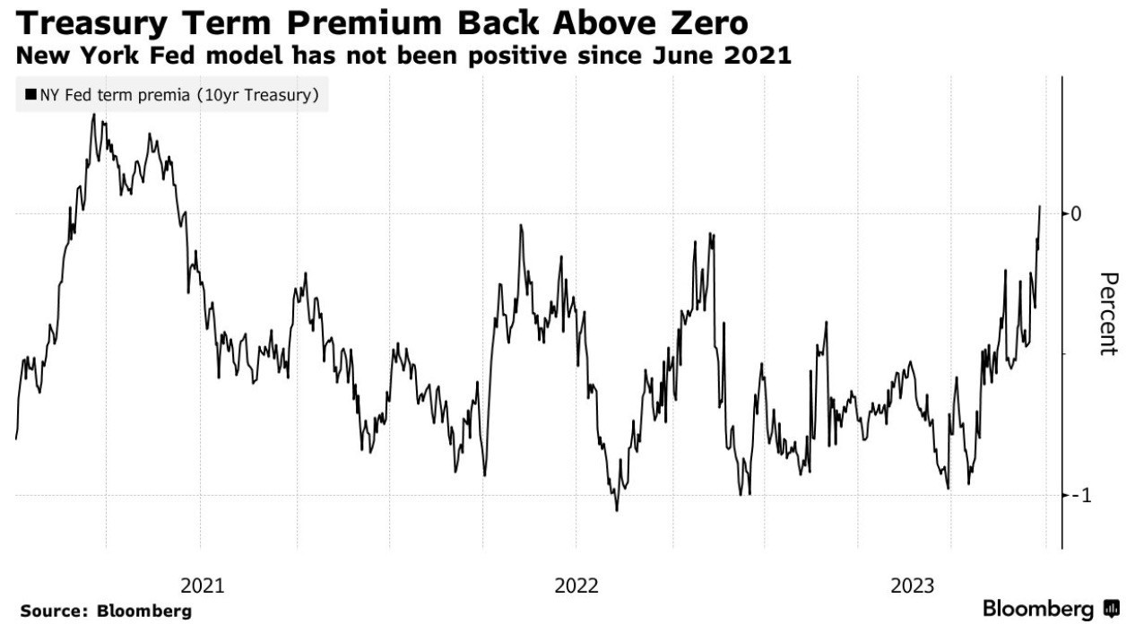此外,10年期美国国债的“期限溢价指标”(一项反映债券投资者持有长期债券所获得额外收益的指标,越高说明投资者要求长期持有的证券提供更高的收益率)自2021年6月以来首次转为正值。在期限溢价情形之下,投资者通常要求长期持有的证券提供额外高收益率。