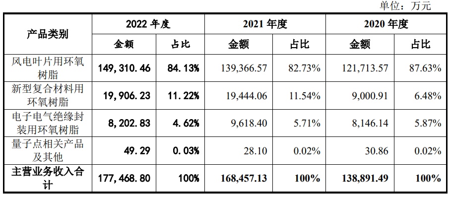 招股书披露,惠柏新材主营业务为特种配方改性环氧树脂系列产品的研发、生产和销售,主要包括风电叶片用环氧树脂、新型复合材料用环氧树脂、电子电气绝缘封装用环氧树脂等多个应用系列产品。此外,公司还少量销售用于Mini\Micro LED的量子点色转换墨水等产品以及为客户提供量子点应用的相关解决方案与服务。