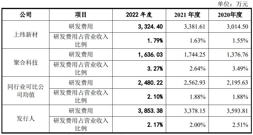 报告期内,公司研发费用金额及占比高于同行业可比公司均值。2020年度、2021年度、2022年度,公司研发费用合计金额约为1.08亿元。公司研发费用投入占营业收入比例情况如下:
