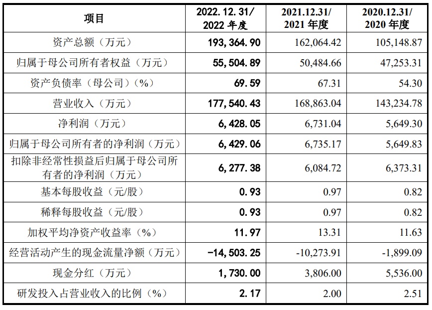 财务方面,于2020年度、2021年度及2022年度,公司实现营业收入分别约为14.32亿元、16.89亿元、17.75亿元。公司净利润分别约为5649.3万元、6731.04万元、6428.05万元人民币。