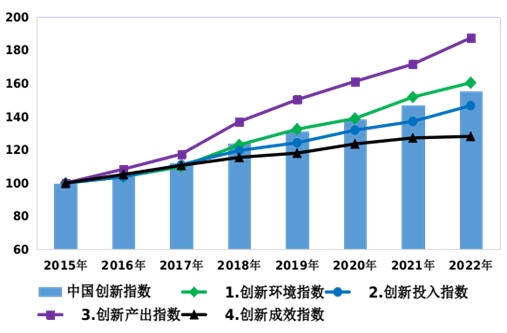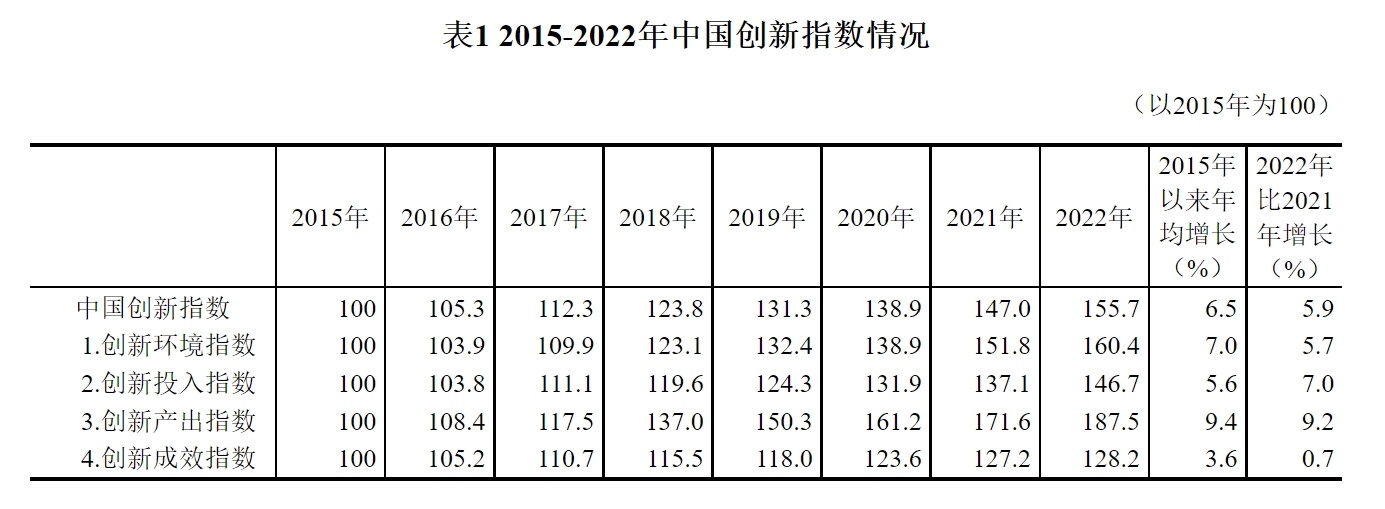测算结果显示,以2015年为基期,2022年中国创新指数为155.7,4个分领域指数创新环境指数、创新投入指数、创新产出指数和创新成效指数分别为160.4、146.7、187.5和128.2。与2015年相比,中国创新指数年均增长6.5%,比同期国内生产总值(GDP)增速快0.8个百分点;4个分领域指数年均增速分别为7.0%、5.6%、9.4%和3.6%。与2021年相比,中国创新指数增长5.9%,4个分领域指数分别增长5.7%、7.0%、9.2%和0.7%(详见表1)。