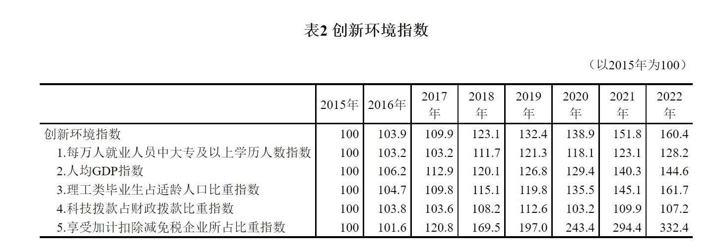 以2015年为100,2022年我国创新环境指数为160.4,年均增长7.0%。分指标看,享受加计扣除减免税企业所占比重指数大幅提升,年均增速达18.7%,2022年指数值达332.4,在中国创新指数的全部18个指标中位列第一;理工类毕业生占适龄人口比重指数、人均GDP指数、每万人就业人员中大专及以上学历人数指数、科技拨款占财政拨款比重指数的年均增速分别为7.1%、5.4%、3.6%和1.0%,2022年指数值相应为161.7、144.6、128.2和107.2(详见表2)。