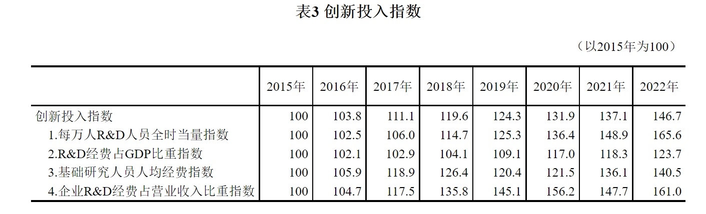 以2015年为100,2022年我国创新投入指数为146.7,年均增长5.6%。分指标看,每万人R&D人员全时当量指数增长相对较快,年均增速为7.5%,2022年指数值为165.6;企业R&D经费占营业收入比重指数、基础研究人员人均经费指数、R&D经费占GDP比重指数的年均增速分别为7.0%、5.0%和3.1%,2022年指数值相应为161.0、140.5和123.7(详见表3)。