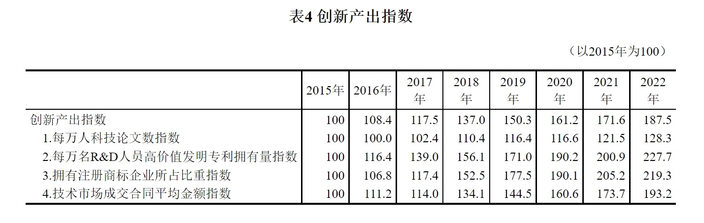 以2015年为100,2022年我国创新产出指数为187.5,年均增长9.4%。分指标看,每万名R&D人员高价值发明专利拥有量指数、拥有注册商标企业所占比重指数实现大幅提升,年均增速分别达12.5%和11.9%,2022年指数值分别为227.7和219.3,在全部18个指标中位列第二和第三;技术市场成交合同平均金额指数增长也较快,年均增速为9.9%,2022年指数值为193.2;每万人科技论文数指数年均增速为3.6%,2022年指数值为128.3(详见表4)。
