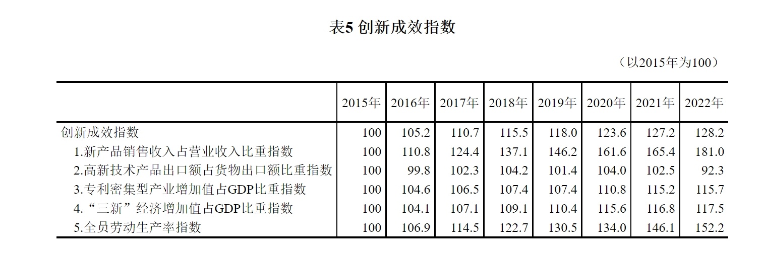 以2015年为100,2022年我国创新成效指数为128.2,年均增长3.6%。分指标看,新产品销售收入占营业收入比重指数增长相对较快,年均增速为8.8%,2022年指数值为181.0;全员劳动生产率指数、“三新”经济增加值占GDP比重指数、专利密集型产业增加值占GDP比重指数、高新技术产品出口额占货物出口额比重指数的年均增速分别为6.2%、2.3%、2.1%和-1.1%,2022年指数值相应为152.2、117.5、115.7和92.3(详见表5)。