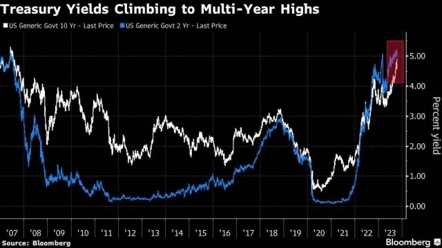 本周,美国10年期国债收益率飙升超过30个基点,周四达到4.98%,为2007年7月以来的最高水平,一度触及5%。稍早,美联储主席鲍威尔表示,美国经济强劲且劳动力市场持续紧张,可能需要更严格的借贷条件来控制通胀,不过市场利率上升可能降低美联储采取行动的必要性。Allspring Global Investments的投资组合经理Noah Wise表示:“鲍威尔今天的言论无疑是推动利率升至5%的一个重要因素。”
