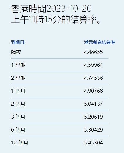 智通财经APP获悉,10月20日,港元拆息几乎全线反弹,仅六个月期续跌。其中,隔夜息升至4.48655%。与楼按相关的一个月拆息亦中止两连跌,由五周新低回升至4.90768%。