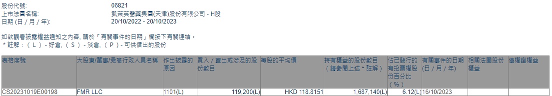 LLC增持凯莱英(06821)11.92万股,每股作价118.8151港元,总金额约为1416.28万港元。增持后最新持股数目约为168.71万股,最新持股比例为6.12%。