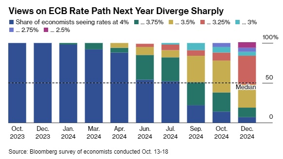 调查显示,受访者认为欧洲央行不会进一步加息,并预计管理委员会将在明年1月份确认利率已经达到峰值。他们预计,继早些时候加快缩减资产负债表的举措之后,该央行将在明年9月份将首次降息。
