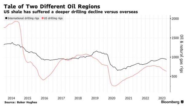 不过,相比上一季度,该公司北美营收环比下降6%,这是自2021年初以来首次出现环比下滑。随着美国页岩油发展的放缓,油田承包商正将更多工作转向海外。斯伦贝谢超过四分之三的销售额来自北美以外地区。今年迄今为止,美国石油钻井平台数量下降了19%。