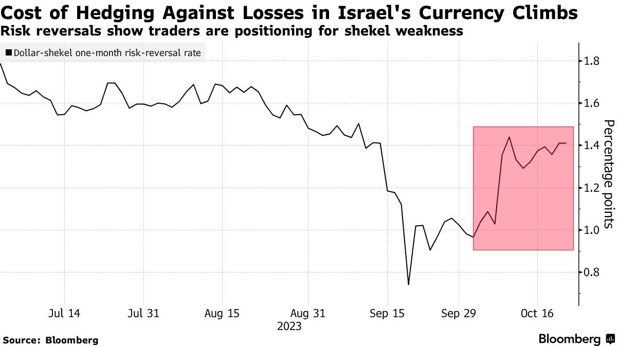 风险逆转数据显示,防范未来一个月谢克尔下跌的额外成本(相对于防范上涨的额外成本)周四已攀升至1.4个百分点,而近两周前以色列宣布进入战争状态前夕,这一成本约为1个百分点。以一个月期限的隐含波动率衡量的预期汇率波动幅度,则是自哈马斯发动袭击和以色列对加沙地带进行报复性空袭打击以来全球范围内最大的幅度。