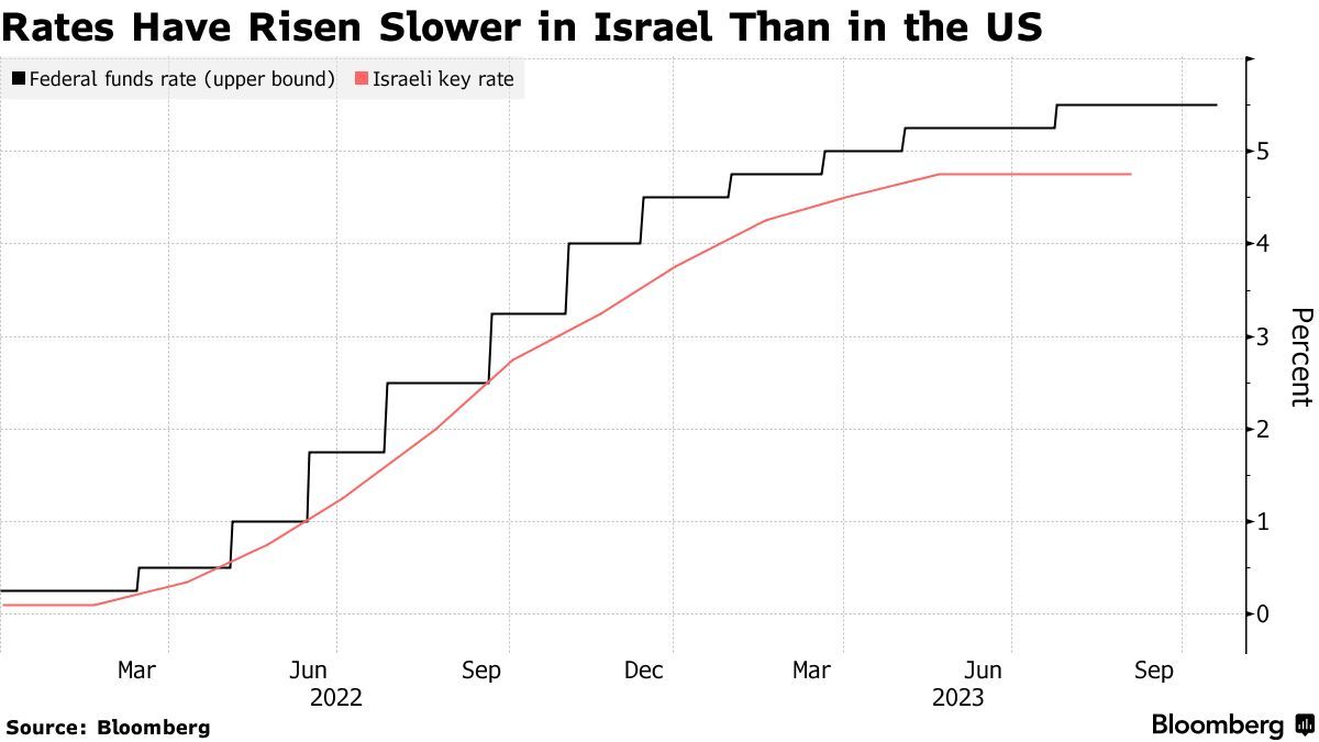 几乎所有接受彭博社调查的经济学家都预测,以色列央行将把基准利率维持在4.75%不变。从2022年初开始的10次加息之后,以色列央行在7月之后一直暂停加息,在2022年初期时基准利率接近于零。