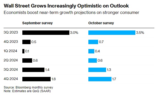 智通财经APP获悉,随着消费者继续保持支出,经济学家上调了到2024年初的美国经济增长预期,并对经济衰退的预期降至一年来的最低水平。