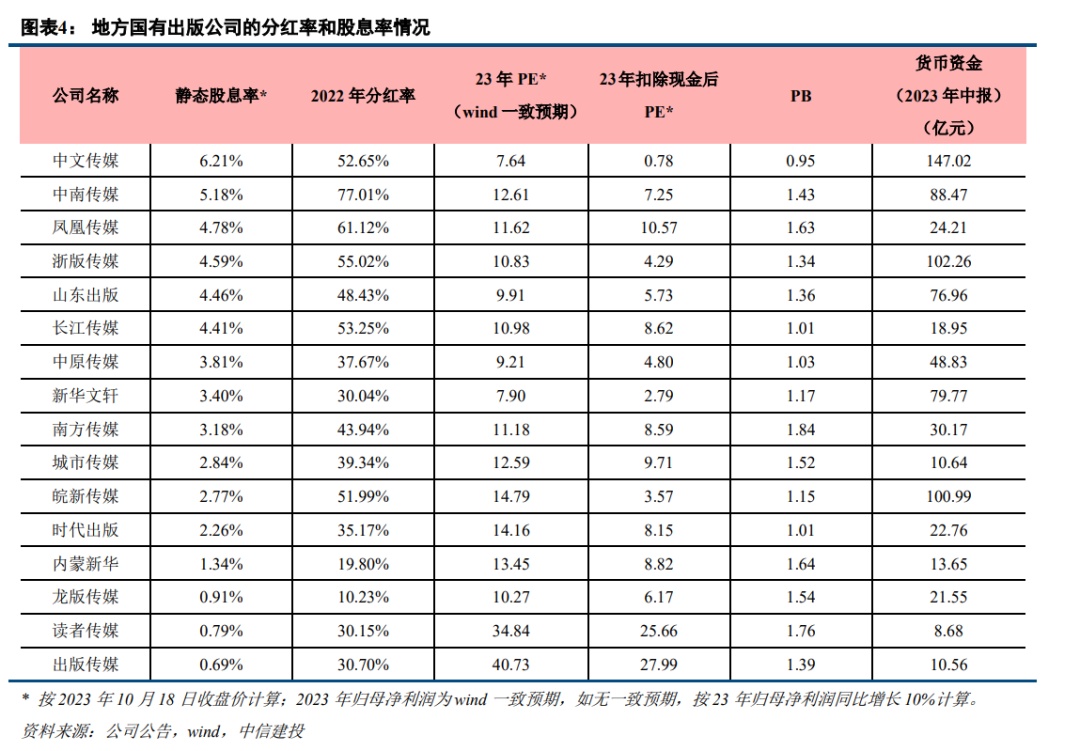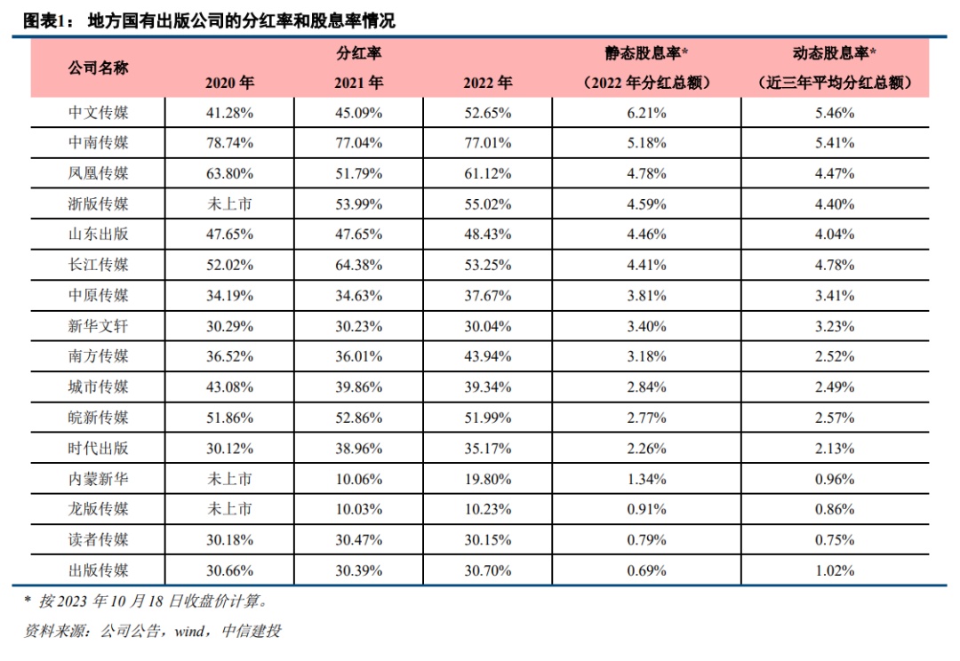 按23年10月18日收盘价,从静态股息率(以22年分红总额为基准)看,排名前五的公司分别是中文传媒、中南传媒、凤凰传媒、浙版传媒和山东出版,静态股息率分别是6.21%、5.18%、4.78%、4.59%和4.46%。如以过去三年平均分红总额为基准,中文传媒、中南传媒、凤凰传媒和浙版传媒同样位列前五(浙版传媒于21年7月上市,因此是以过去两年平均分红总额为基准),动态股息率分别是5.46%、5.41%、4.47%和4.40%。
